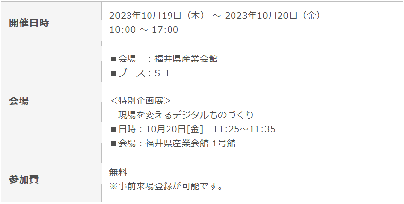 当社は福井商工会議所で開催される「北陸技術交流テクノフェア 2023」に出展いたします。