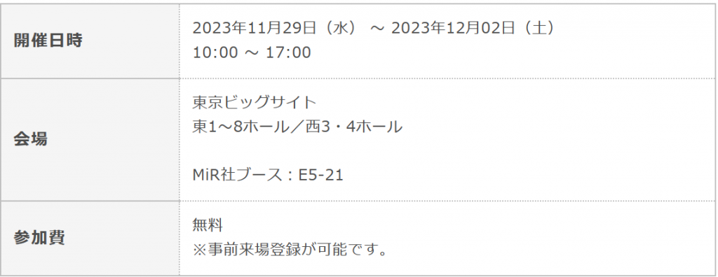 東京ビッグサイトで開催される「2023国際ロボット展」にMiR社が出展いたします。