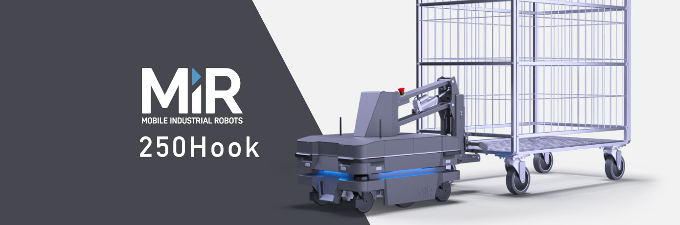 MiR250Hookは、MiRの中で最速かつ最もコンパクトなMiR250に、台車牽引用のトップモジュールが搭載された自律走行搬送ロボット(AMR)です。